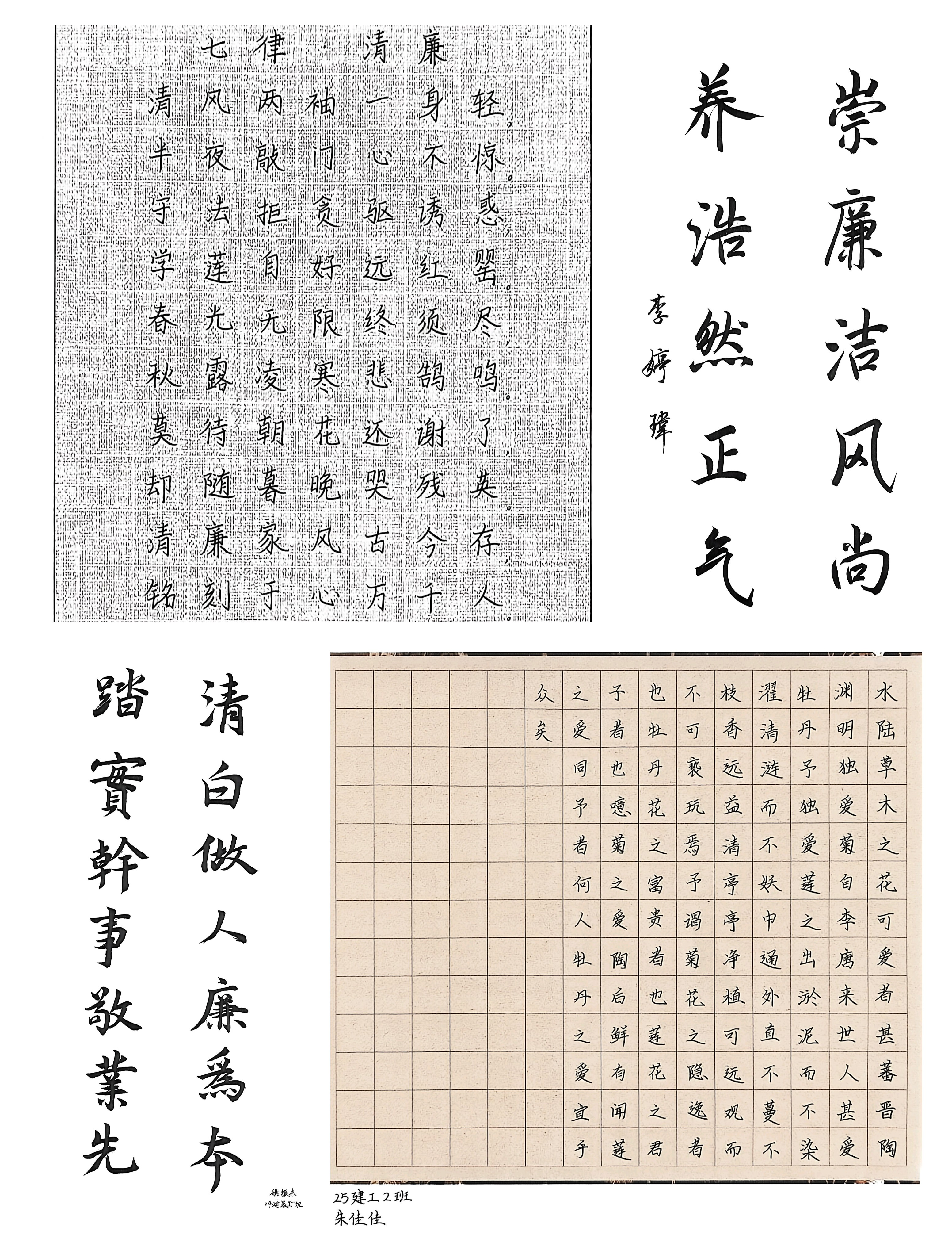 33份作品中,每一份都饱含创作者对主题的深刻理解,手绘作品亮点纷呈、意蕴深远:有的以水彩笔触勾勒出亭亭玉立的莲花,或衬以清水、山石,借“出淤泥而不染”的经典意象,隐喻廉洁自律的高尚品格;有的细致刻画包拯、海瑞等古代清官画像,人物神情坚毅、正气凛然,通过再现历史名人的廉洁事迹,传递跨越时空的清廉力量。软硬笔书法作品同样笔力遒劲,“清风劲节”“廉以修身”“匠心守廉”等字句在墨香中传递着浩然正气,与手绘作品相映成趣。