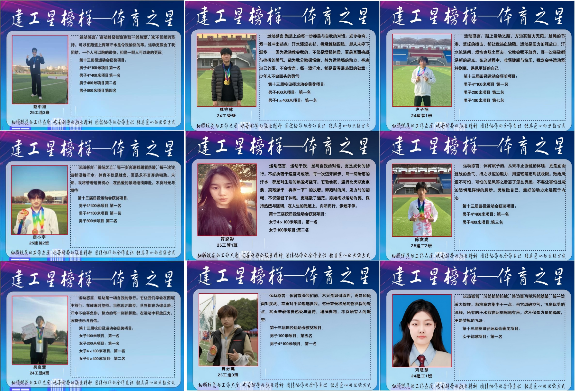 为进一步发挥先进典型的示范引领作用,激发广大学生参与体育锻炼的热情,营造“比学赶超、奋勇争先”的校园氛围,近日,建筑工程学院成功举办“建工星榜样——体育之星”评选活动。本次活动主要依据我校第十三届田径运动会中建工学院运动健儿们的竞技表现与得分情况,经过综合评议,最终评选出9名成绩突出的运动员,授予“体育之星”荣誉称号。他们分别是:25工造3班赵中旭、25建装2班房小宇、24工造4班吴庭慧等同学。他们在赛场上挥洒汗水、顽强拼搏,不仅为学院赢得了荣誉,更充分展现了建工学子昂扬向上、奋发有为的精神风貌。
