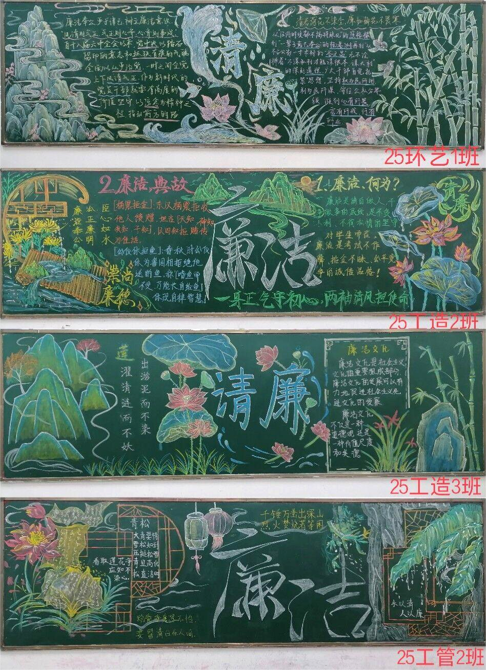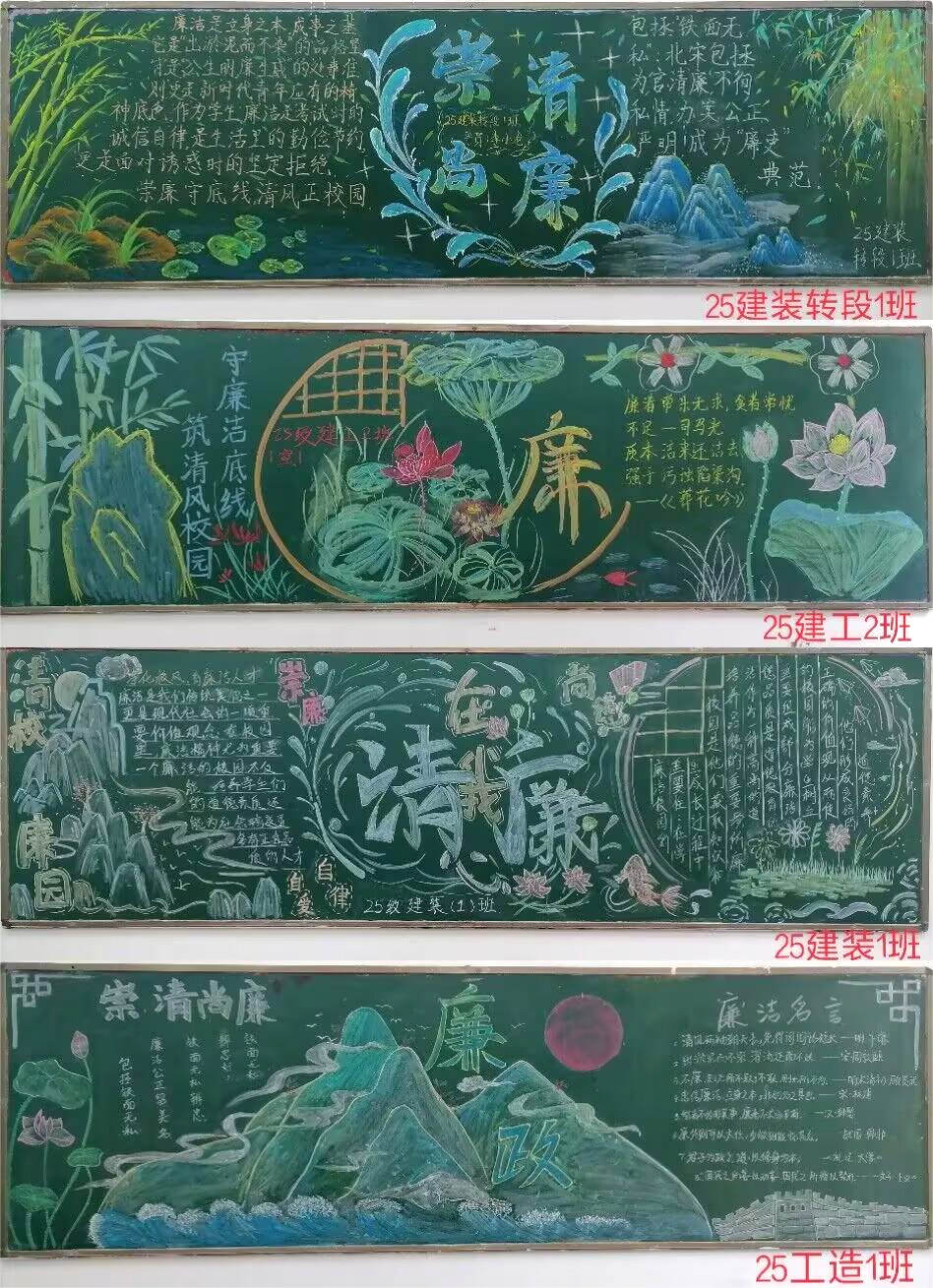 同学们围绕“崇清尚廉”主题,结合建筑工程专业特色与校园生活实际,充分发挥想象力与创造力,将廉洁元素巧妙融入黑板报设计之中。各班同学分工协作、默契配合,有的负责构图设计,以简约大气的线条勾勒廉洁主题框架;有的专注文字撰写,摘录廉洁名言警句、讲述古今廉洁故事;有的精心配色填画,用清新雅致的色彩营造出浓厚的廉洁文化氛围。