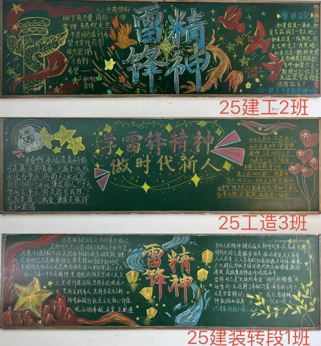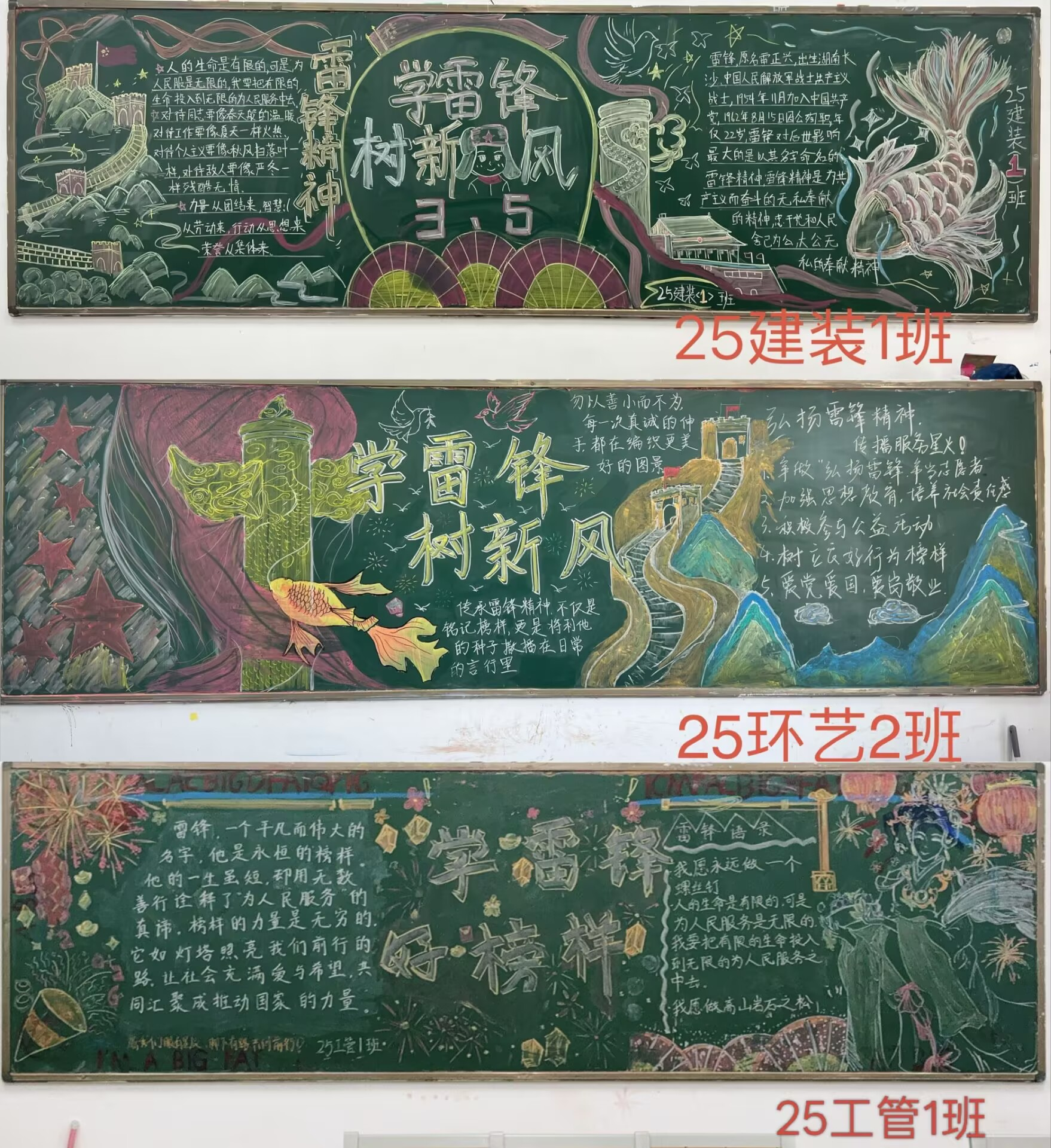 全院各班级积极响应,充分利用课余时间全身心投入黑板报创作。同学们紧扣雷锋精神核心主题,结合建筑工程学院专业特色,广泛搜集雷锋生平事迹、经典名言、新时代雷锋故事、校园志愿服务事迹典型案例等素材,精心规划版面布局、打磨文字内容、设计绘画图案,将严谨细致的专业态度和饱满的青春热情融入每一处细节,把雷锋的奉献精神与建工人的工匠精神巧妙融合。同学们在搜集资料、分工绘制、协作完善的过程中,重温雷锋事迹、感悟榜样力量,进一步加深了对雷锋精神时代内涵的理解与认同,实现了沉浸式自我教育与自我提升。