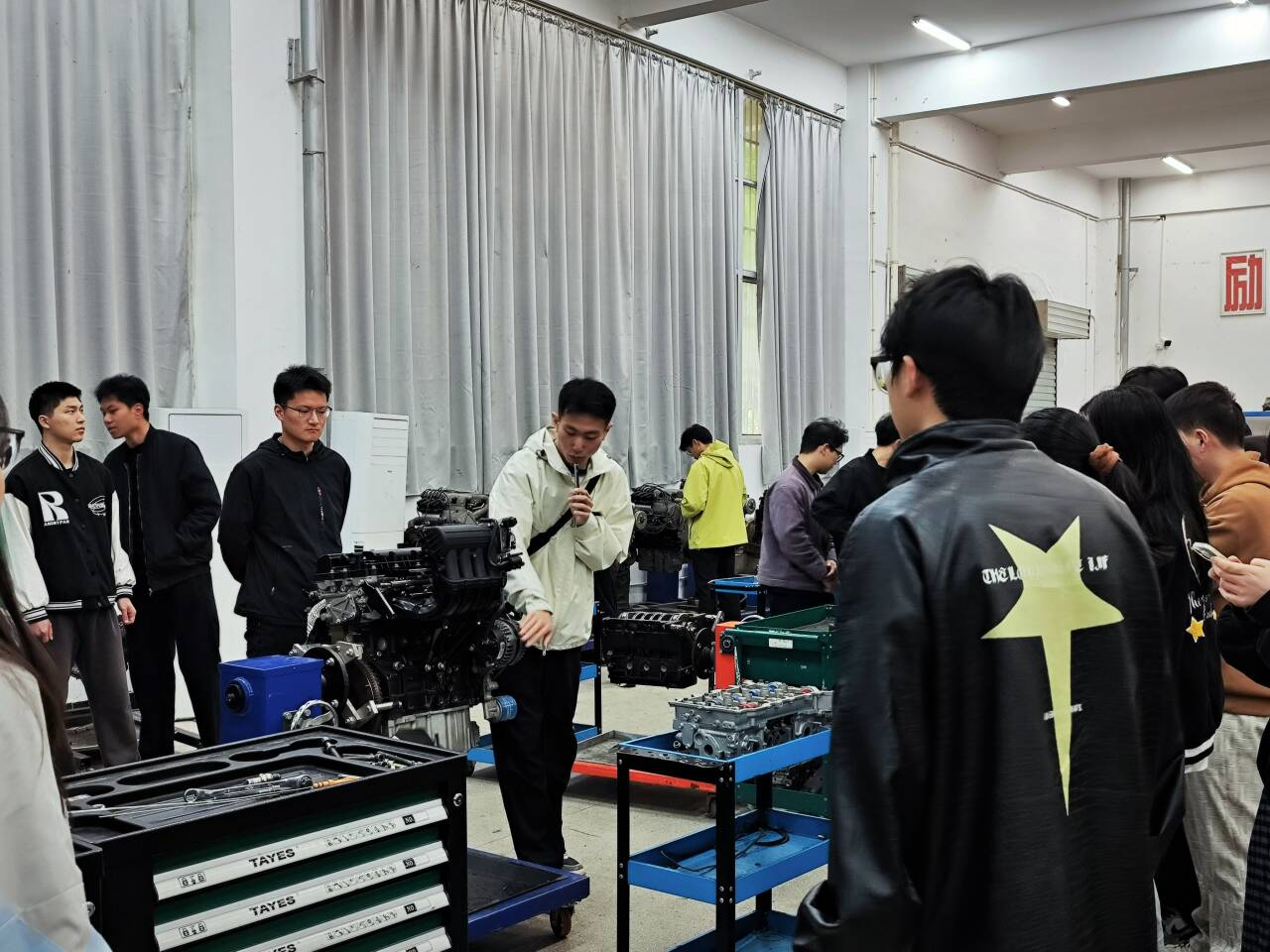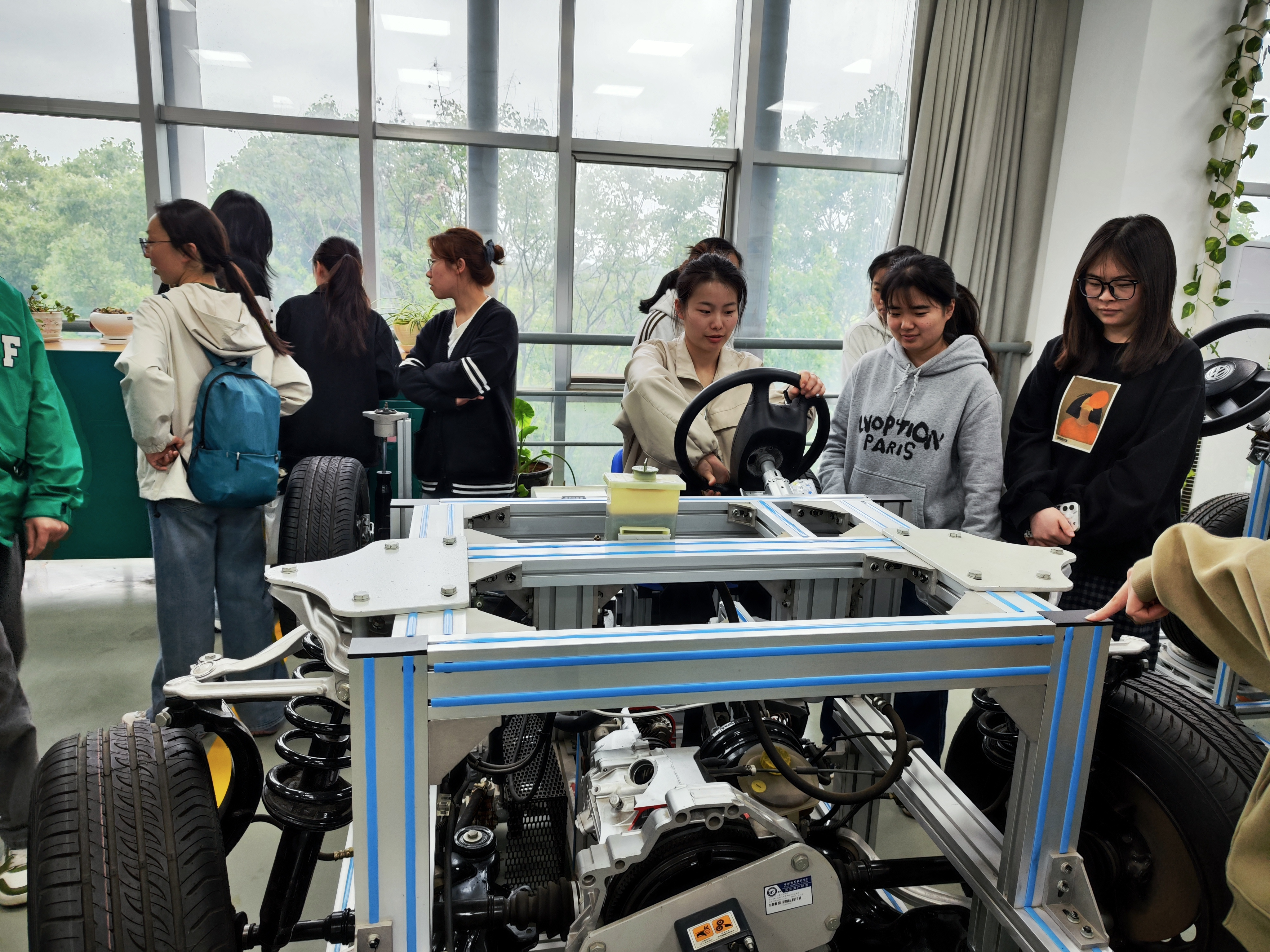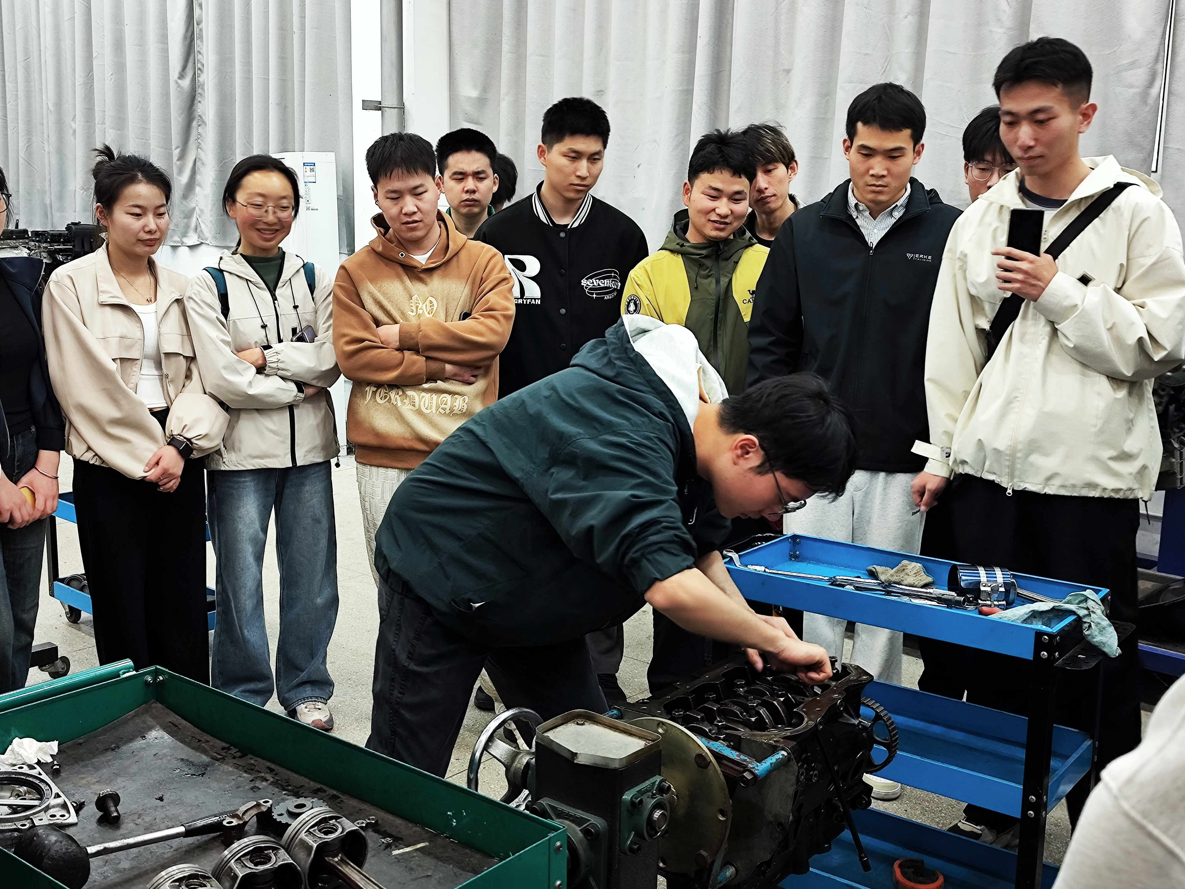 下午2时,同学们有序进入汽车楼。车辆工程专业王志恒同学担任讲解员,带领大家依次参观铸魂工作室、上汽通用ASEP校企合作实训中心,以及发动机、底盘、电气、保险及金工实训中心。他用通俗易懂的语言讲解整车结构与系统工作原理,将专业知识与工匠精神有机融合,帮助同学们全面了解汽车产业的技术体系与职业要求。