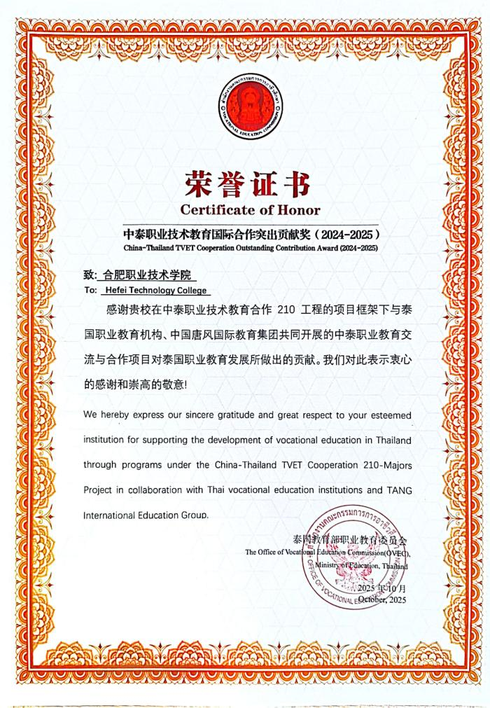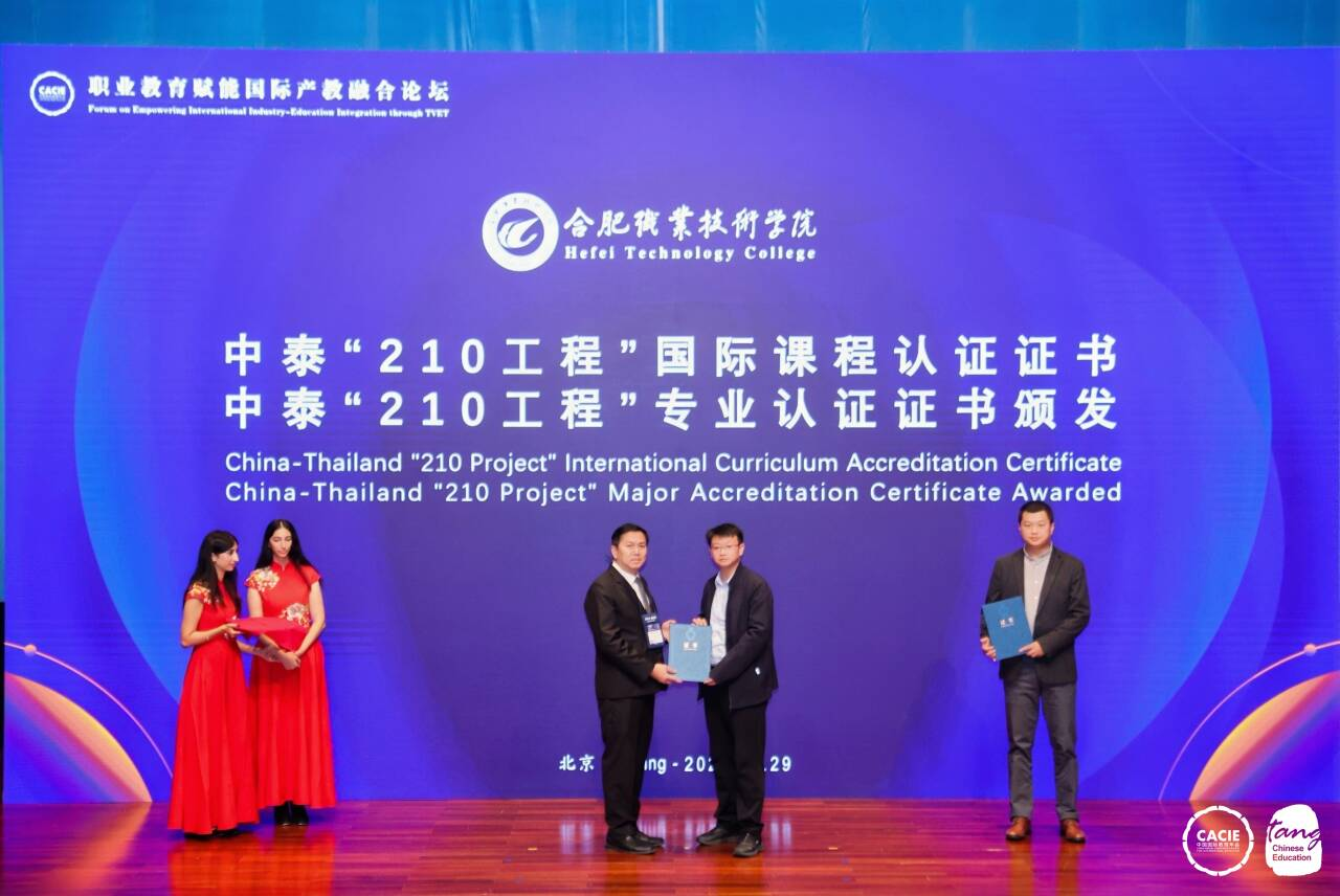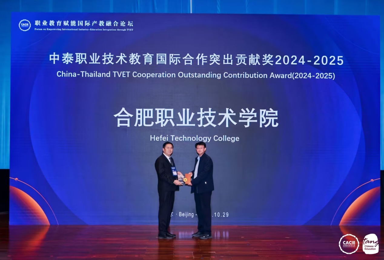 10月29日—11月1日,第26届中国国际教育年会“职业教育赋能国际产教融合分论坛”在北京国家会议中心举行。会上,合肥职业技术学院建筑工程学院凭借中泰职业技术教育国际合作“210工程”项目,荣获泰国教育部专业认证、课程认证及中泰职业技术教育国际合作突出贡献奖。