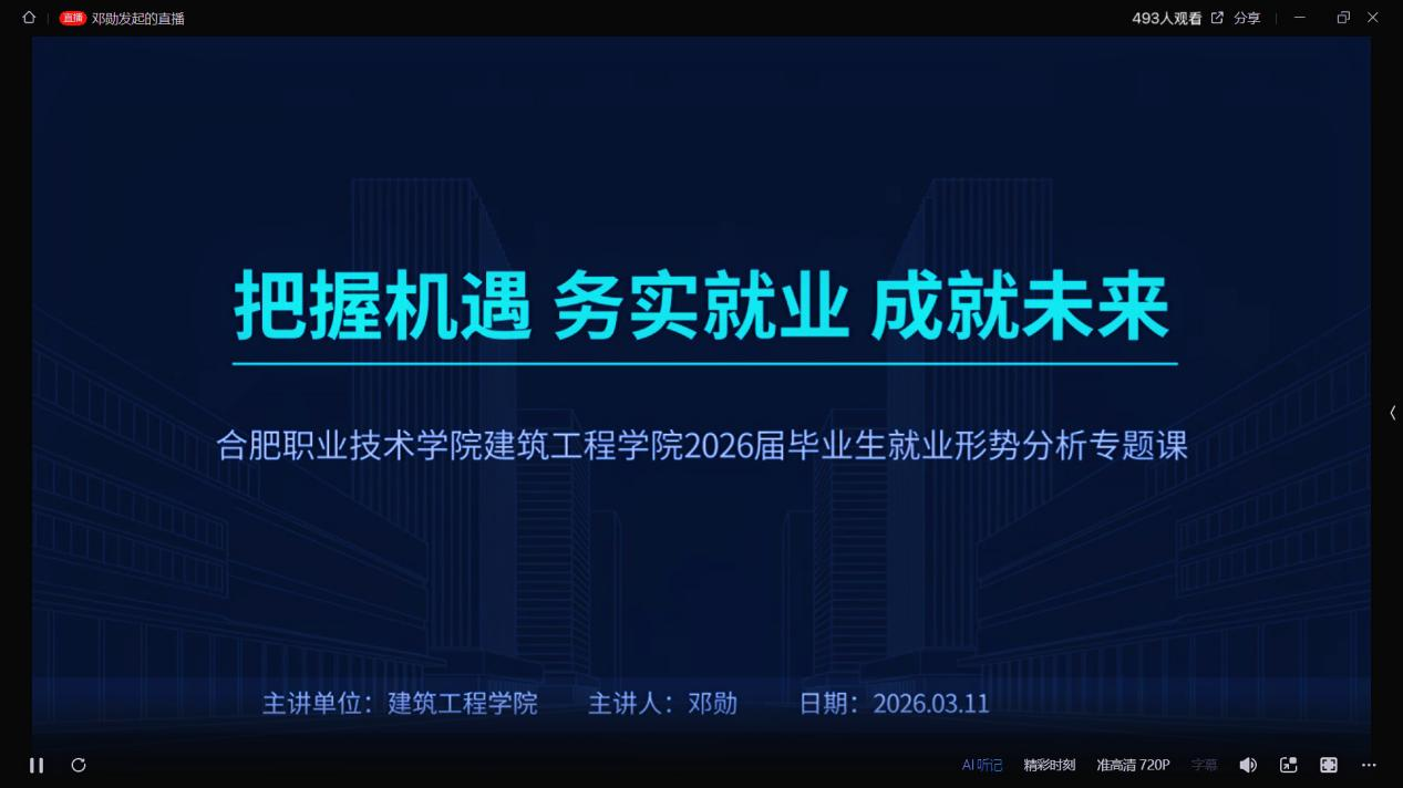 为应对建筑行业深度转型新形势,助力2026届毕业生平稳、优质就业,2026年3月11日晚,建筑工程学院举办2026届毕业生就业形势分析专题直播课。学院副院长邓勋担任主讲,围绕行业趋势、求职路径、能力提升等问题,为毕业班学子拨开就业迷雾、明晰前行方向。